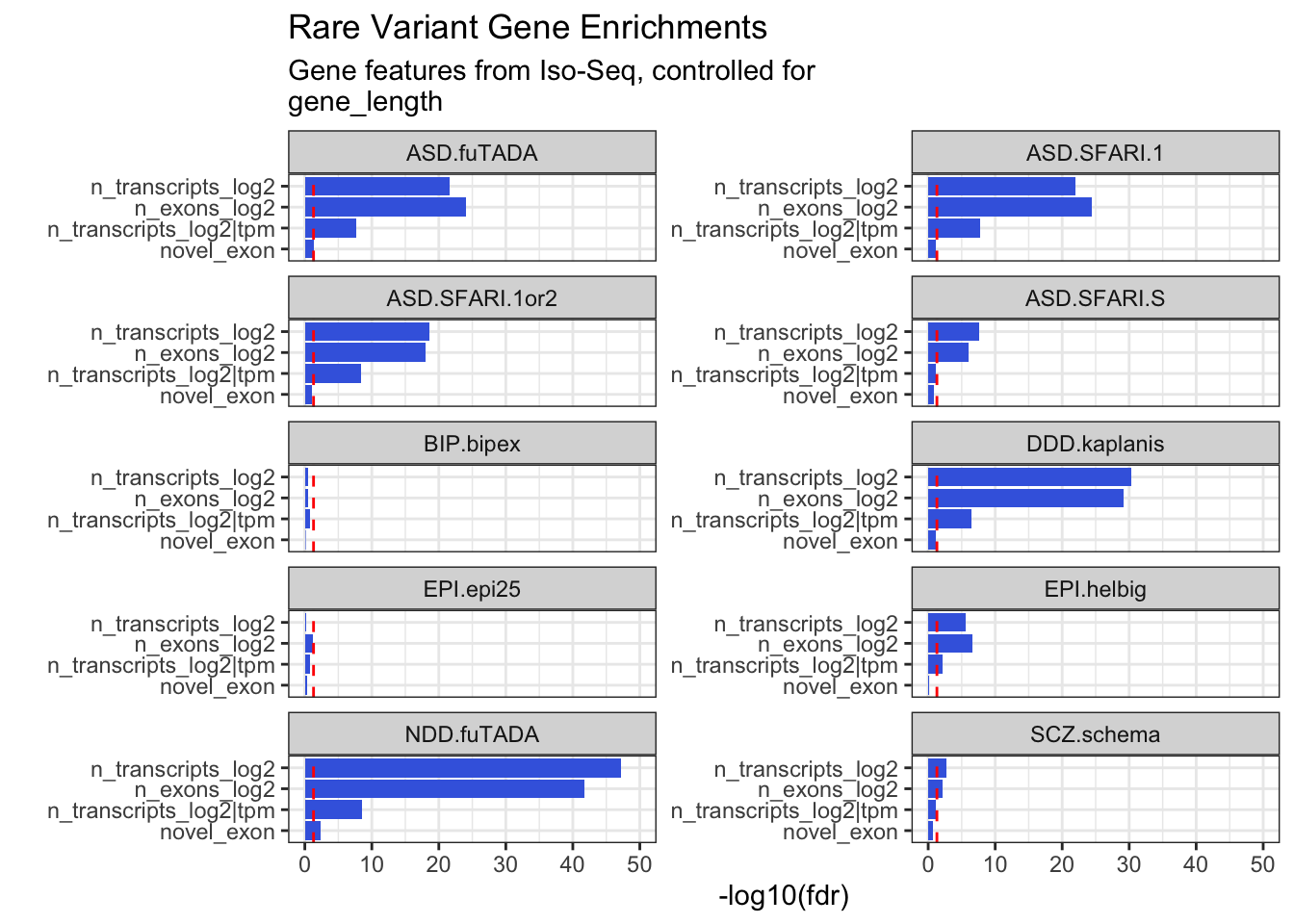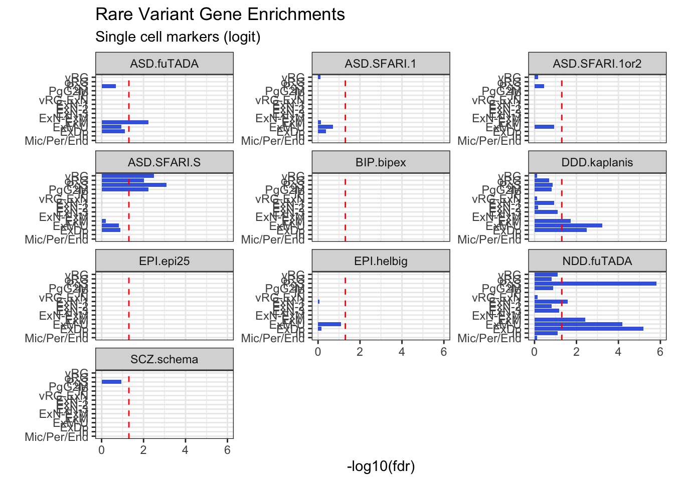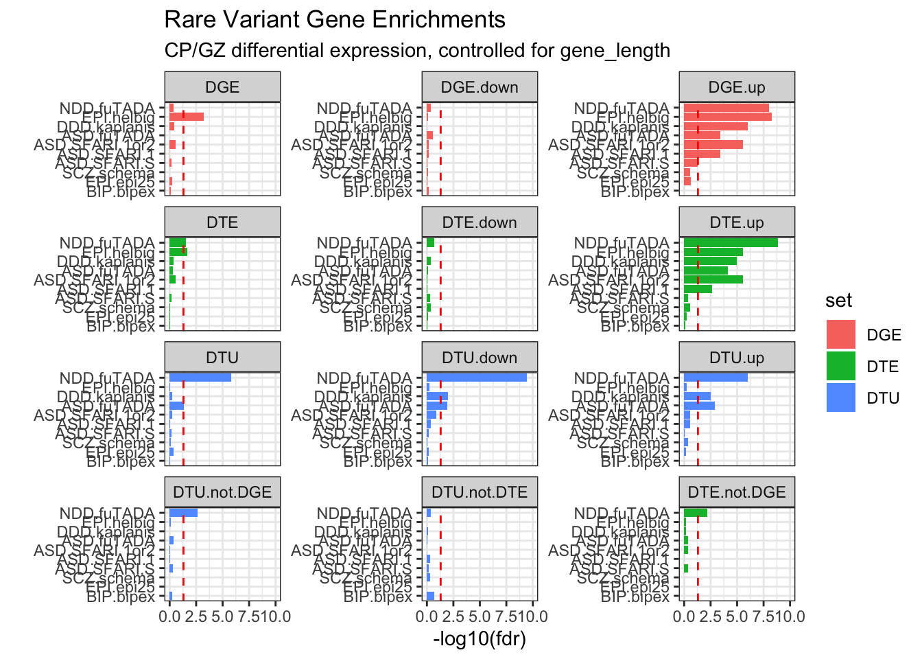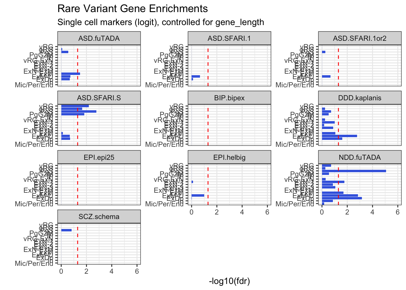 geneAnno = rtracklayer::import("ref/gencode.v33lift37.annotation.gtf.gz") %>%as_tibble() %>%filter(type=='gene')geneAnno$ensg =substr(geneAnno$gene_id,1,15)geneAnno = geneAnno[match(unique(geneAnno$ensg), geneAnno$ensg),]#Binary vector 0 for all protein coding genes, NA for non-coding; will replace with 1 for rare variant disease risk geneprotein_coding_bg =rep(NA, times=nrow(geneAnno))protein_coding_bg[geneAnno$gene_type=="protein_coding"] =0names(protein_coding_bg) = geneAnno$ensg#Start with compiled list of risk genes from SFARI, Kaplanis,risk_genes =read.csv("ref/ASD+SCZ+DDD_2022.csv")rareVar.binary =data.frame(ASD.SFARI.1 = protein_coding_bg)rownames(rareVar.binary)= geneAnno$ensgrareVar.binary$ASD.SFARI.1[geneAnno$gene_name %in% risk_genes$Gene[risk_genes$Set=="ASD (SFARI score 1)"]] =1rareVar.binary$ASD.SFARI.1or2 = protein_coding_bgrareVar.binary$ASD.SFARI.1or2[geneAnno$gene_name %in% risk_genes$Gene[risk_genes$Set=="ASD (SFARI score 1or2)"]] =1rareVar.binary$ASD.SFARI.S = protein_coding_bgrareVar.binary$ASD.SFARI.S[geneAnno$gene_name %in% risk_genes$Gene[risk_genes$Set=="ASD (SFARI syndromic)"]] =1rareVar.binary$DDD.kaplanis = protein_coding_bgrareVar.binary$DDD.kaplanis[geneAnno$gene_name %in% risk_genes$Gene[risk_genes$Set=="DDD (Kaplanis et al. 2019)"]] =1epilepsy_helbig = openxlsx::read.xlsx('http://epilepsygenetics.net/wp-content/uploads/2023/01/Channelopathist_genes_internal_2023_v2.xlsx')rareVar.binary$EPI.helbig = protein_coding_bgrareVar.binary$EPI.helbig[geneAnno$gene_name %in% epilepsy_helbig$Gene] =1# Fu et al., Nat Genetics 2022 -- ASD, NDD TADAfu=openxlsx::read.xlsx(('https://static-content.springer.com/esm/art%3A10.1038%2Fs41588-022-01104-0/MediaObjects/41588_2022_1104_MOESM3_ESM.xlsx'),'Supplementary Table 11')fu$p_TADA_ASD[fu$p_TADA_ASD==0] =min(fu$p_TADA_ASD[fu$p_TADA_ASD >0],na.rm=T)fu$p_TADA_NDD[fu$p_TADA_NDD==0] =min(fu$p_TADA_NDD[fu$p_TADA_NDD >0],na.rm=T)rareVar.logit = rareVar.binaryrareVar.logit$ASD.fuTADA=-log10(fu$p_TADA_ASD)[match(geneAnno$ensg, fu$gene_id)]rareVar.binary$ASD.fuTADA=as.numeric(fu$FDR_TADA_ASD[match(geneAnno$ensg, fu$gene_id)] < .1)rareVar.logit$NDD.fuTADA =-log10(fu$p_TADA_NDD)[match(geneAnno$ensg, fu$gene_id)]rareVar.binary$NDD.fuTADA =as.numeric(fu$FDR_TADA_NDD[match(geneAnno$ensg, fu$gene_id)] < .1)SCZ.schema =read_tsv('ref/risk_genes/SCHEMA_gene_results.tsv')