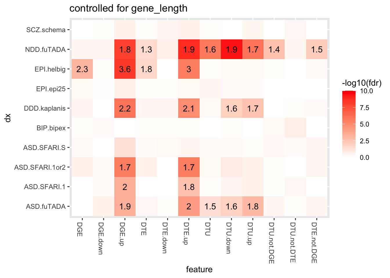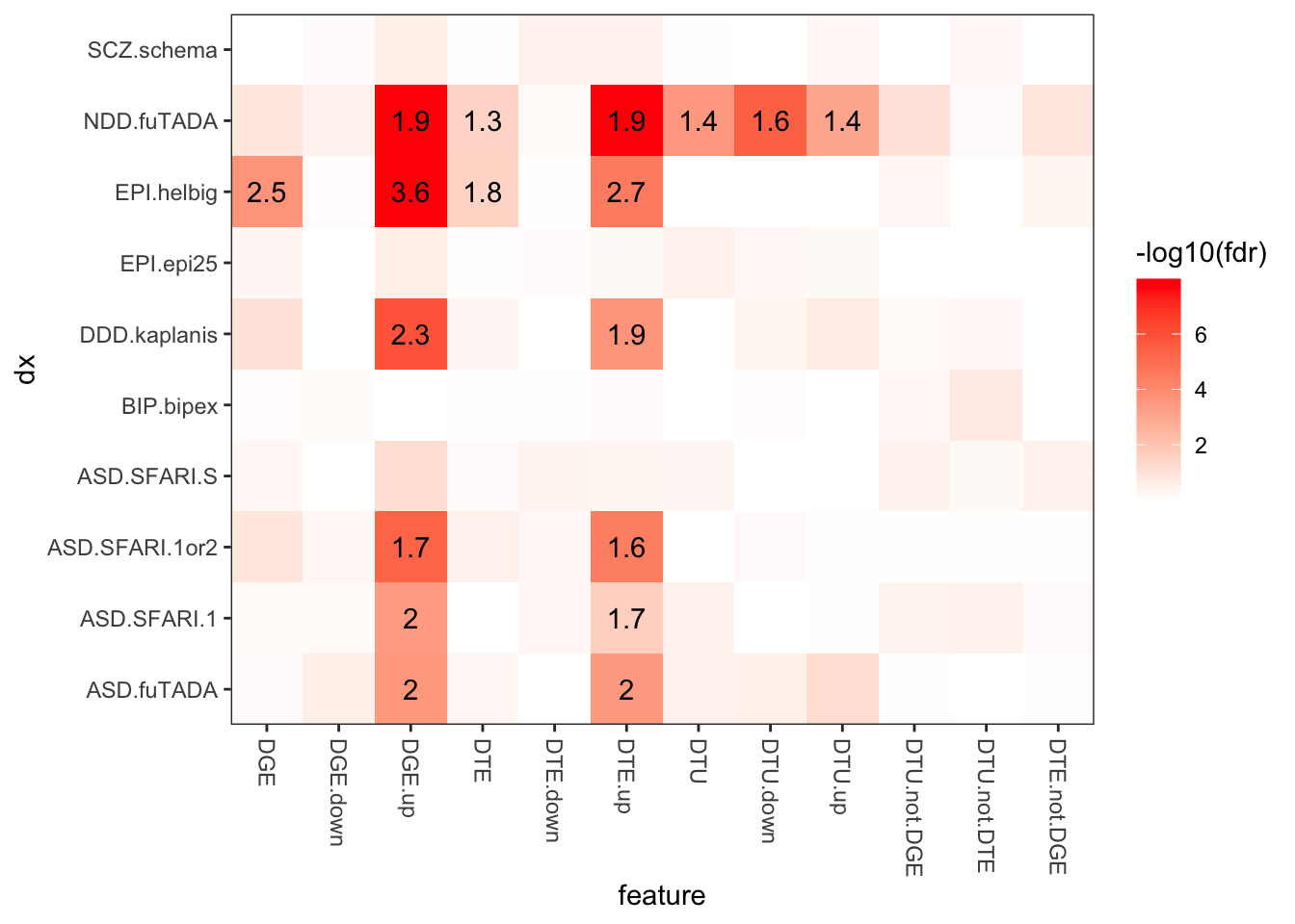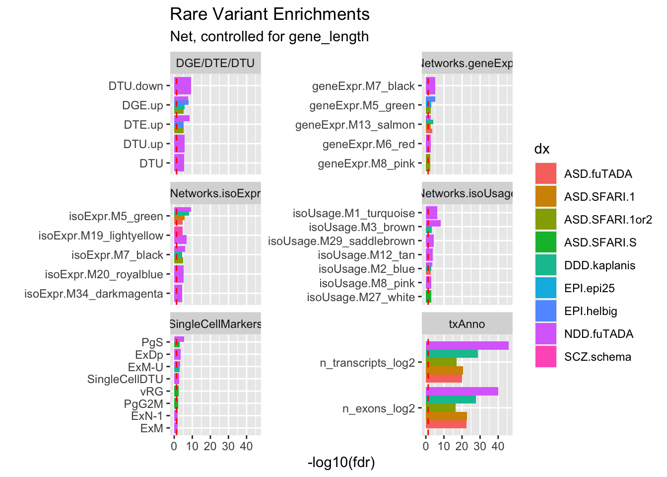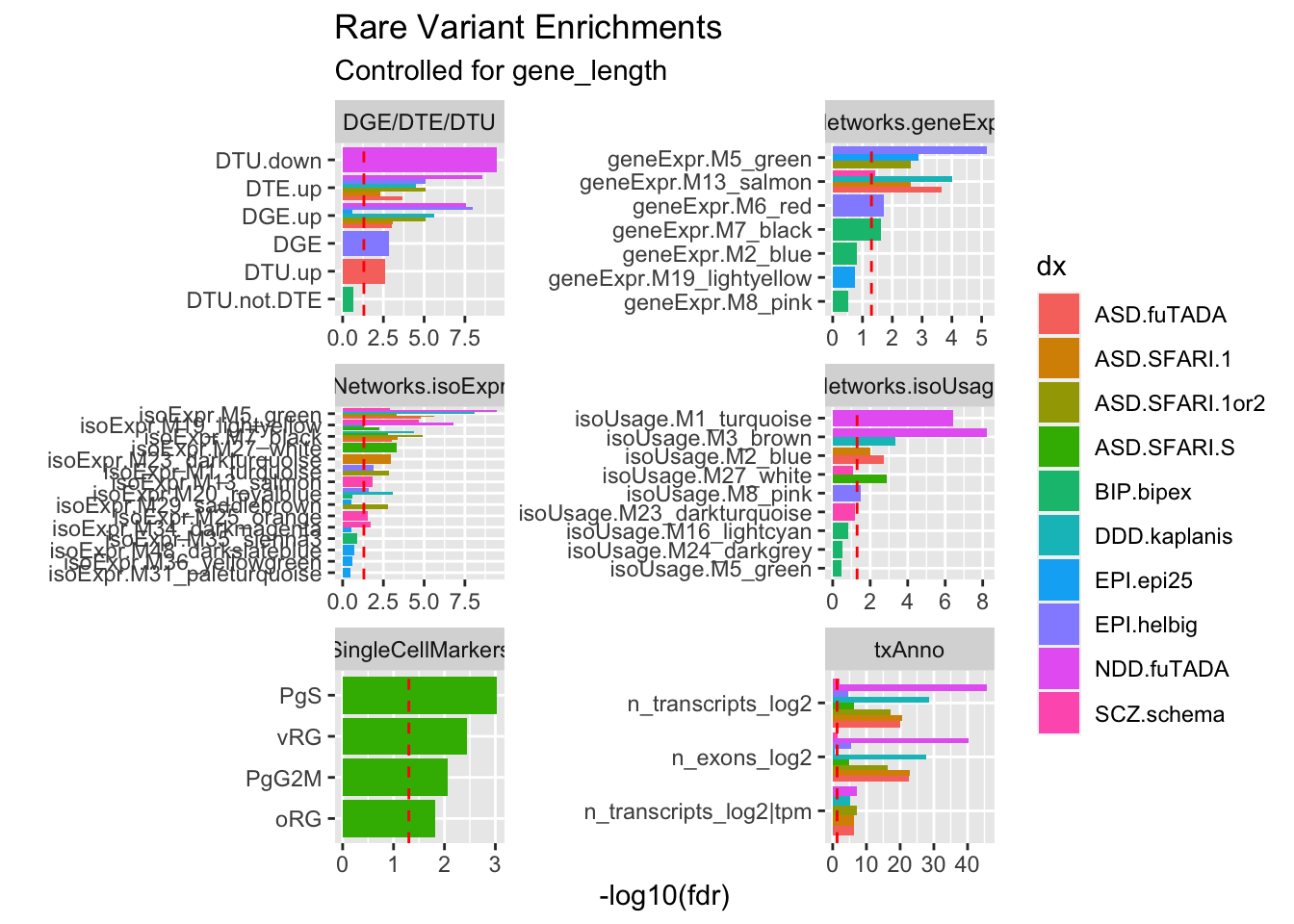 geneAnno = rtracklayer::import("ref/gencode.v33lift37.annotation.gtf.gz") %>%as_tibble() %>%filter(type=='gene')geneAnno$ensg =substr(geneAnno$gene_id,1,15)geneAnno = geneAnno[match(unique(geneAnno$ensg), geneAnno$ensg),]#Binary vector 0 for all protein coding genes, NA for non-coding; will replace with 1 for rare variant disease risk geneprotein_coding_bg =rep(NA, times=nrow(geneAnno))protein_coding_bg[geneAnno$gene_type=="protein_coding"] =0names(protein_coding_bg) = geneAnno$ensg#Start with compiled list of risk genes from SFARI, Kaplanis,risk_genes =read.csv("ref/ASD+SCZ+DDD_2022.csv")rareVar.binary =data.frame(ASD.SFARI.1 = protein_coding_bg)rownames(rareVar.binary)= geneAnno$ensgrareVar.binary$ASD.SFARI.1[geneAnno$gene_name %in% risk_genes$Gene[risk_genes$Set=="ASD (SFARI score 1)"]] =1rareVar.binary$ASD.SFARI.1or2 = protein_coding_bgrareVar.binary$ASD.SFARI.1or2[geneAnno$gene_name %in% risk_genes$Gene[risk_genes$Set=="ASD (SFARI score 1or2)"]] =1rareVar.binary$ASD.SFARI.S = protein_coding_bgrareVar.binary$ASD.SFARI.S[geneAnno$gene_name %in% risk_genes$Gene[risk_genes$Set=="ASD (SFARI syndromic)"]] =1rareVar.binary$DDD.kaplanis = protein_coding_bgrareVar.binary$DDD.kaplanis[geneAnno$gene_name %in% risk_genes$Gene[risk_genes$Set=="DDD (Kaplanis et al. 2019)"]] =1epilepsy_helbig = openxlsx::read.xlsx('http://epilepsygenetics.net/wp-content/uploads/2023/01/Channelopathist_genes_internal_2023_v2.xlsx')rareVar.binary$EPI.helbig = protein_coding_bgrareVar.binary$EPI.helbig[geneAnno$gene_name %in% epilepsy_helbig$Gene] =1# Fu et al., Nat Genetics 2022 -- ASD, NDD TADAfu=openxlsx::read.xlsx(('https://static-content.springer.com/esm/art%3A10.1038%2Fs41588-022-01104-0/MediaObjects/41588_2022_1104_MOESM3_ESM.xlsx'),'Supplementary Table 11')fu$p_TADA_ASD[fu$p_TADA_ASD==0] =min(fu$p_TADA_ASD[fu$p_TADA_ASD >0],na.rm=T)fu$p_TADA_NDD[fu$p_TADA_NDD==0] =min(fu$p_TADA_NDD[fu$p_TADA_NDD >0],na.rm=T)rareVar.logit = rareVar.binaryrareVar.logit$ASD.fuTADA=-log10(fu$p_TADA_ASD)[match(geneAnno$ensg, fu$gene_id)]rareVar.binary$ASD.fuTADA=as.numeric(fu$FDR_TADA_ASD[match(geneAnno$ensg, fu$gene_id)] < .1)rareVar.logit$NDD.fuTADA =-log10(fu$p_TADA_NDD)[match(geneAnno$ensg, fu$gene_id)]rareVar.binary$NDD.fuTADA =as.numeric(fu$FDR_TADA_NDD[match(geneAnno$ensg, fu$gene_id)] < .1)SCZ.schema =read_tsv('ref/risk_genes/SCHEMA_gene_results.tsv')