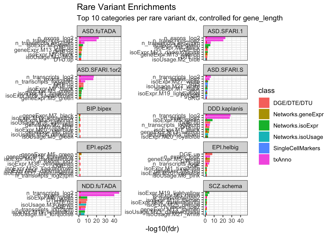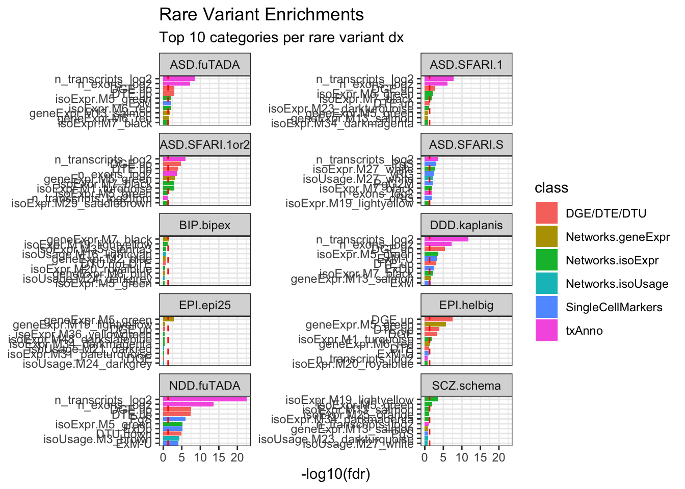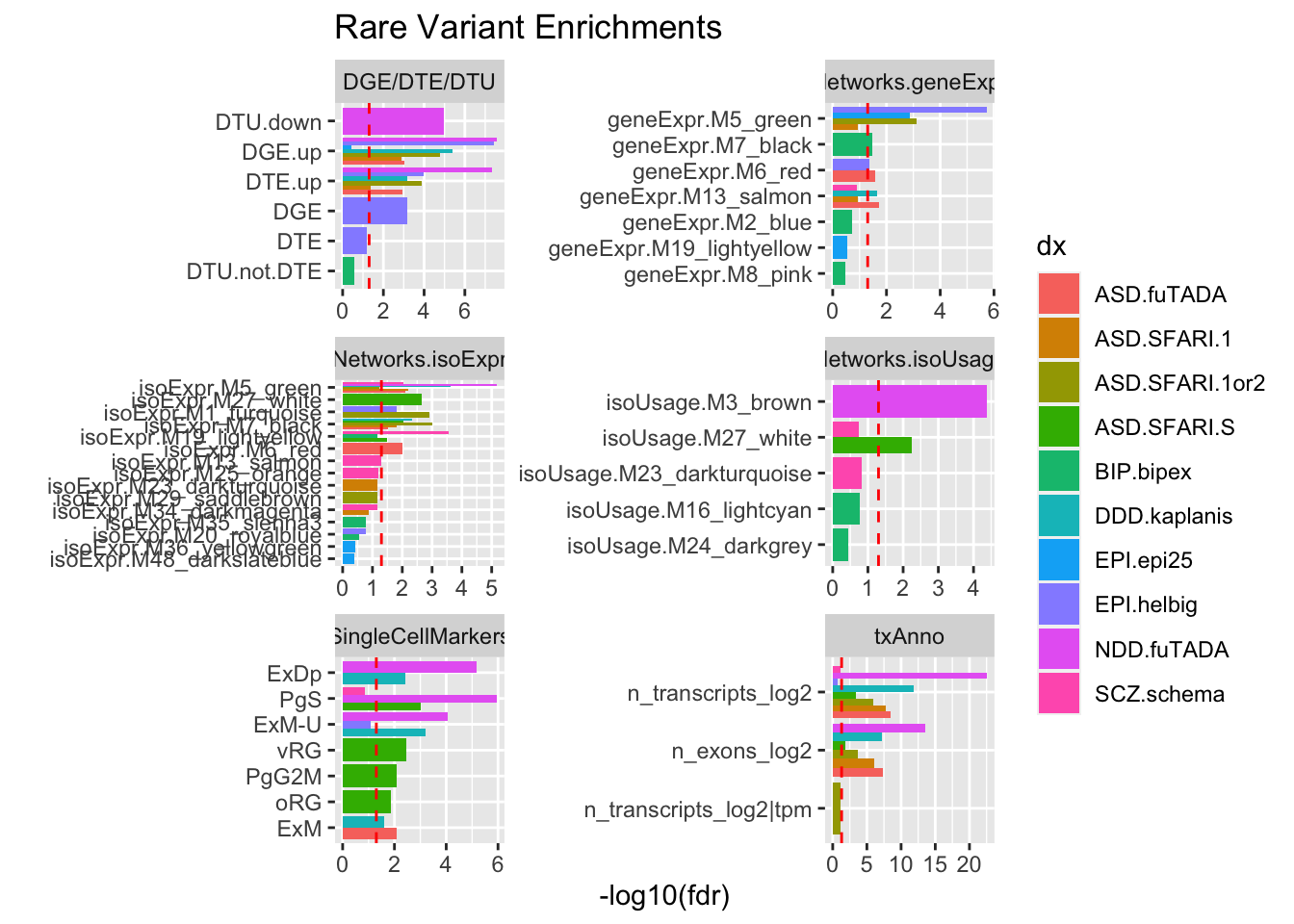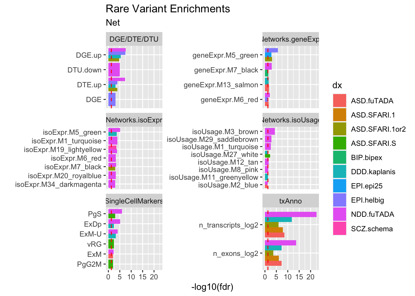 geneAnno = rtracklayer::import("ref/gencode.v33lift37.annotation.gtf.gz") %>%as_tibble() %>%filter(type=='gene')geneAnno$ensg =substr(geneAnno$gene_id,1,15)geneAnno = geneAnno[match(unique(geneAnno$ensg), geneAnno$ensg),]#Binary vector 0 for all protein coding genes, NA for non-coding; will replace with 1 for rare variant disease risk geneprotein_coding_bg =rep(NA, times=nrow(geneAnno))protein_coding_bg[geneAnno$gene_type=="protein_coding"] =0names(protein_coding_bg) = geneAnno$ensg#Start with compiled list of risk genes from SFARI, Kaplanis,risk_genes =read.csv("ref/ASD+SCZ+DDD_2022.csv")rareVar.binary =data.frame(ASD.SFARI.1 = protein_coding_bg)rownames(rareVar.binary)= geneAnno$ensgrareVar.binary$ASD.SFARI.1[geneAnno$gene_name %in% risk_genes$Gene[risk_genes$Set=="ASD (SFARI score 1)"]] =1rareVar.binary$ASD.SFARI.1or2 = protein_coding_bgrareVar.binary$ASD.SFARI.1or2[geneAnno$gene_name %in% risk_genes$Gene[risk_genes$Set=="ASD (SFARI score 1or2)"]] =1rareVar.binary$ASD.SFARI.S = protein_coding_bgrareVar.binary$ASD.SFARI.S[geneAnno$gene_name %in% risk_genes$Gene[risk_genes$Set=="ASD (SFARI syndromic)"]] =1rareVar.binary$DDD.kaplanis = protein_coding_bgrareVar.binary$DDD.kaplanis[geneAnno$gene_name %in% risk_genes$Gene[risk_genes$Set=="DDD (Kaplanis et al. 2019)"]] =1epilepsy_helbig = openxlsx::read.xlsx('http://epilepsygenetics.net/wp-content/uploads/2023/01/Channelopathist_genes_internal_2023_v2.xlsx')rareVar.binary$EPI.helbig = protein_coding_bgrareVar.binary$EPI.helbig[geneAnno$gene_name %in% epilepsy_helbig$Gene] =1# Fu et al., Nat Genetics 2022 -- ASD, NDD TADAfu=openxlsx::read.xlsx(('https://static-content.springer.com/esm/art%3A10.1038%2Fs41588-022-01104-0/MediaObjects/41588_2022_1104_MOESM3_ESM.xlsx'),'Supplementary Table 11')fu$p_TADA_ASD[fu$p_TADA_ASD==0] =min(fu$p_TADA_ASD[fu$p_TADA_ASD >0],na.rm=T)fu$p_TADA_NDD[fu$p_TADA_NDD==0] =min(fu$p_TADA_NDD[fu$p_TADA_NDD >0],na.rm=T)rareVar.logit = rareVar.binaryrareVar.logit$ASD.fuTADA=-log10(fu$p_TADA_ASD)[match(geneAnno$ensg, fu$gene_id)]rareVar.binary$ASD.fuTADA=as.numeric(fu$FDR_TADA_ASD[match(geneAnno$ensg, fu$gene_id)] < .1)rareVar.logit$NDD.fuTADA =-log10(fu$p_TADA_NDD)[match(geneAnno$ensg, fu$gene_id)]rareVar.binary$NDD.fuTADA =as.numeric(fu$FDR_TADA_NDD[match(geneAnno$ensg, fu$gene_id)] < .1)SCZ.schema =read_tsv('ref/risk_genes/SCHEMA_gene_results.tsv')