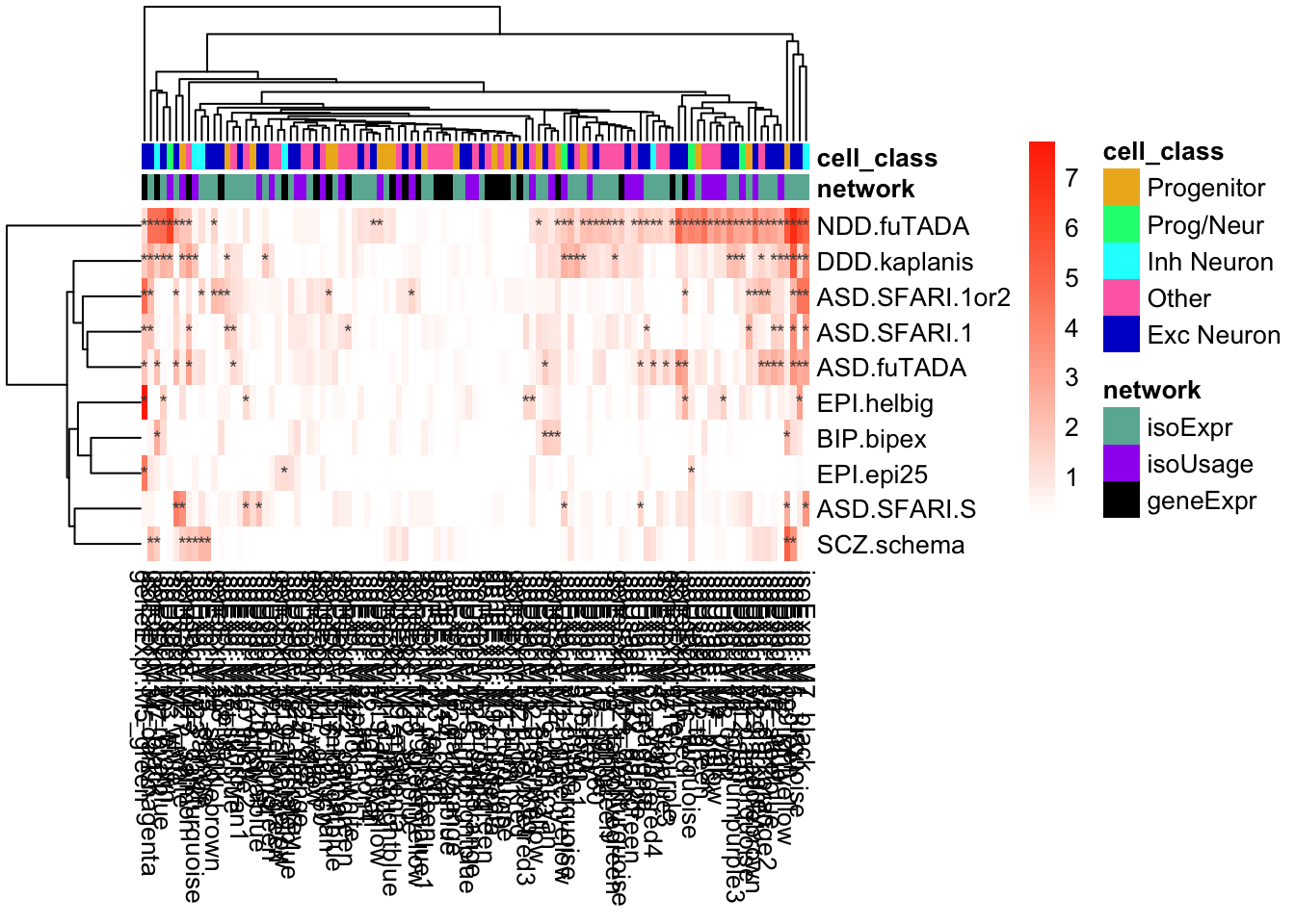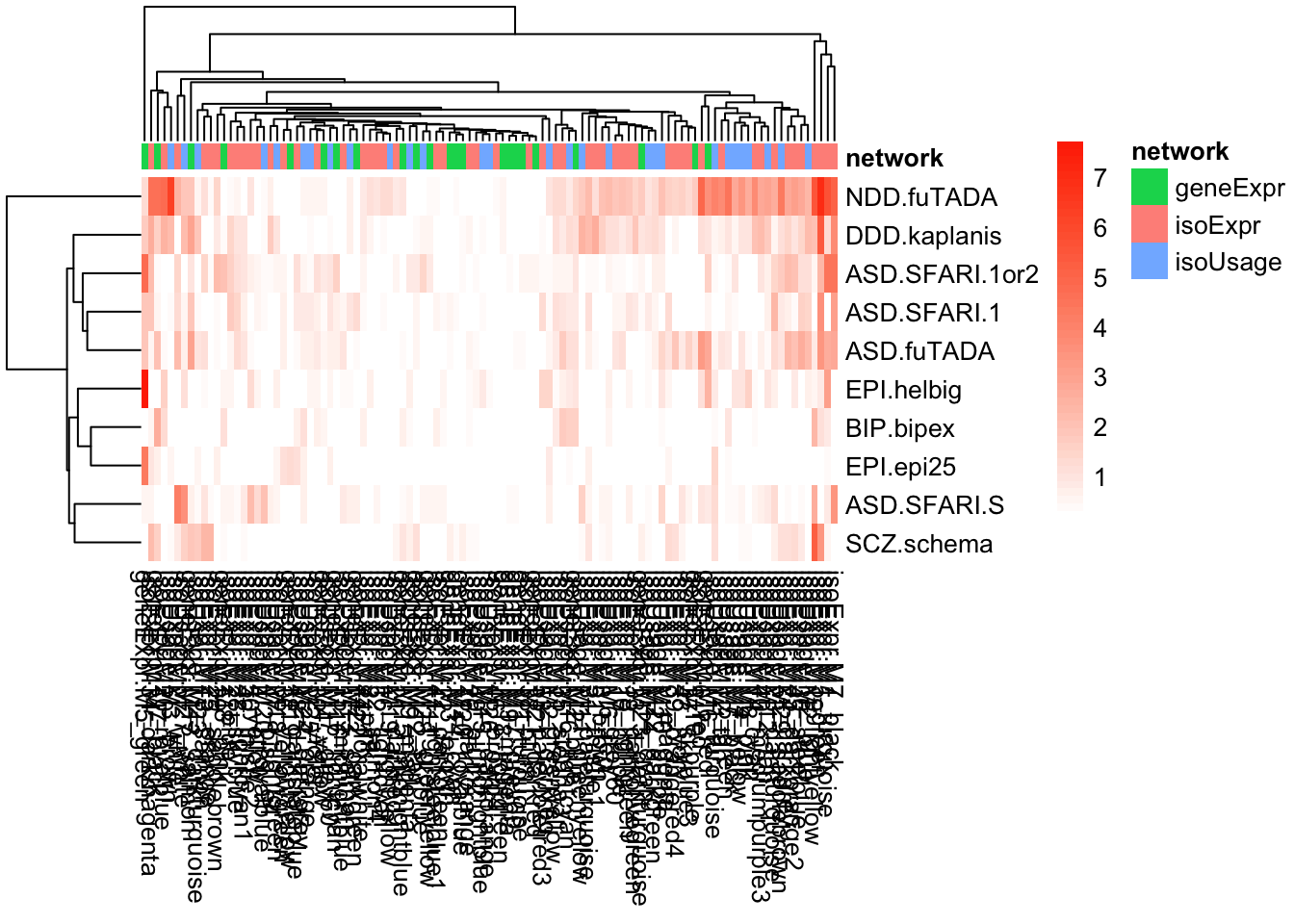 chr (7): network, transcript_id, module.color, module, gene_id, gene_name, ensg